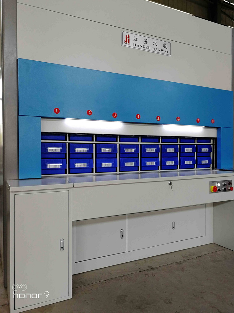 自弹料盒回转库,具有数控回转库相同的原理和功能,它将箱斗横向分隔为若干个存储单元,纵向分隔为两层或多层。这样可以避免数控回转库箱斗运行停止后,还要在单个箱斗中查找物料,特别对中小件、多品种、轻型物料存取,具有安全、准确、快速的优势。同时在单个存储料盒中可以前后分隔,存放不同规格的物料,通过扫码或输入物料编码,设备将自动运行,到达箱斗运行位置,料盒将自动弹出,从而完成物料的自动存取。同时系统将实时记录物料数量、所在存储料盒位置,以方便查询、追溯及自动盘存。